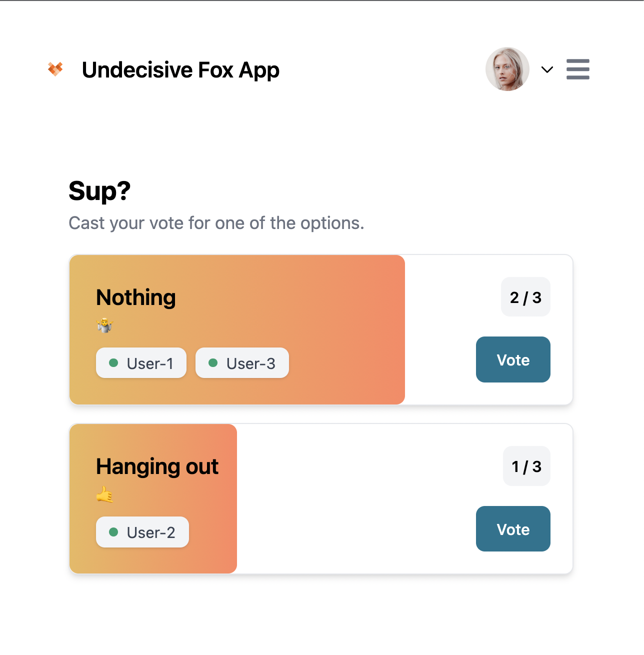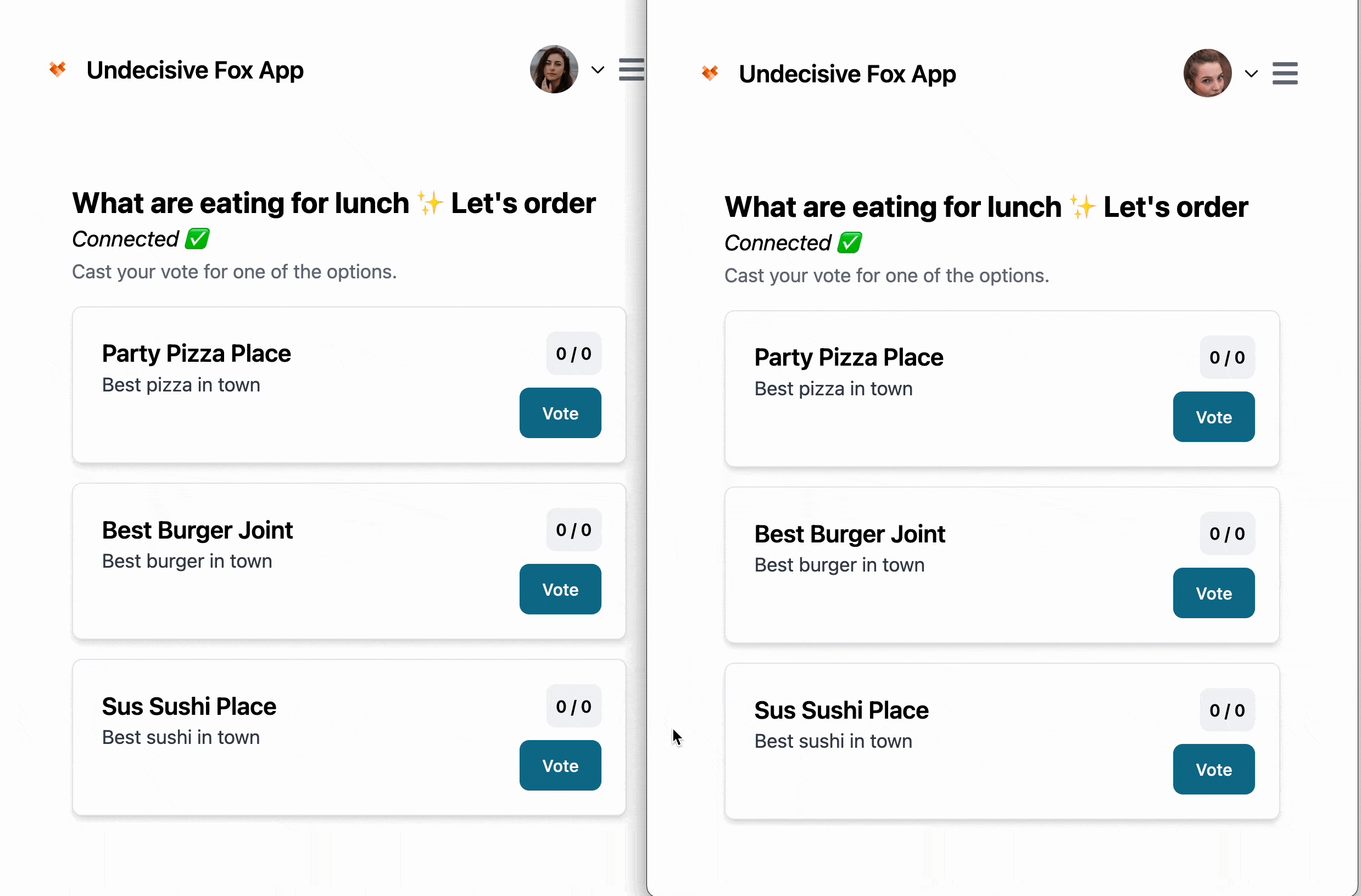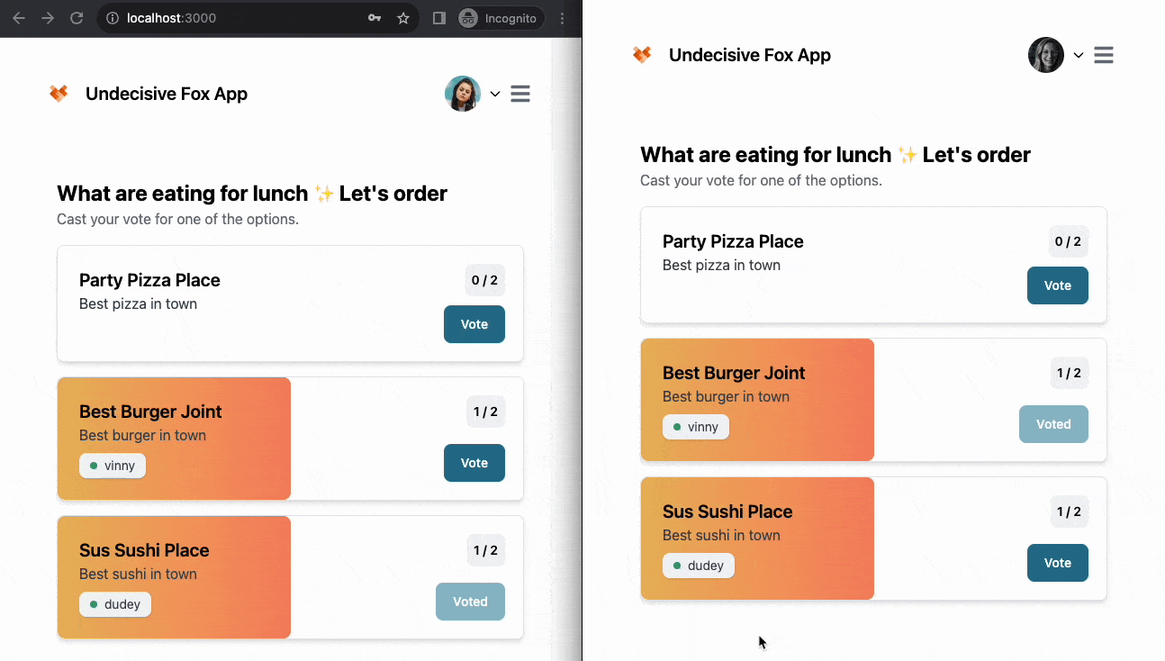 Now if you open up a new private/incognito tab, register a new user, and login, you’ll see a fully working, real-time voting app. The best part is, in comparison to the previous approach, we can log out and back in, and our voting data persists, which is exactly what we’d expect from a production grade app. 🎩
